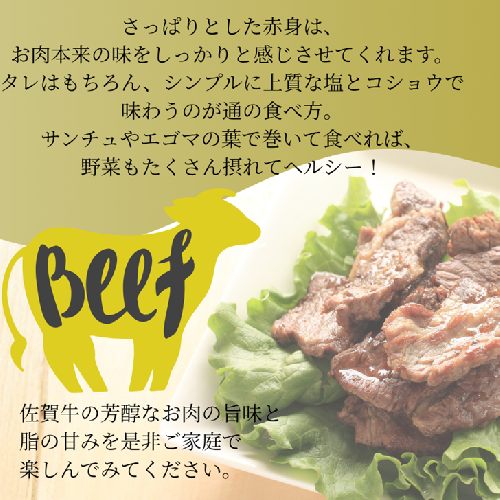 みんなでワイワイ!お腹いっぱい焼肉パーティー! 家族や仲間が集まったら、やっぱり焼肉! 合計1kgの大ボリュームセットで、みんな大満足間違いなしです。 ヘルシーな赤身なので、お子様からご年配の方まで、みんなが安心して楽しめます。 500gずつのパックに分かれているので、大人数のご家族でも、週末に2回に分けてもOK。 ホットプレートを囲んで、ジュージューという音と香ばしい香りと共に、楽しい時間をお過ごしください。 佐賀牛の芳醇なお肉の旨味と脂の甘みを是非ご家庭で楽しんでみてください。 【地場産品基準のうち該当する類型:告示第5条第8ハ号】 上記類型に該当する理由 佐賀県 認定地域資源:佐賀牛