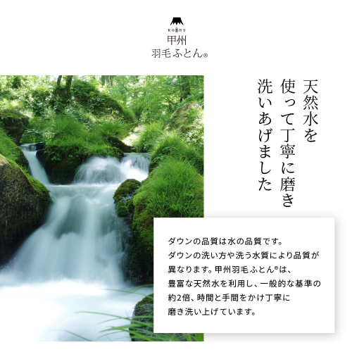 世界遺産「富士山」の大自然の恩恵を受け、天然水で磨かれた羽毛ふとんをぜひお楽しみください。