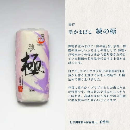舞鶴名産の「練の極」は、京都府舞鶴の懐かしいふるさとの味として、舞鶴ゆかりの皆さまから長年親しまれてきた上質な蒲鉾です。