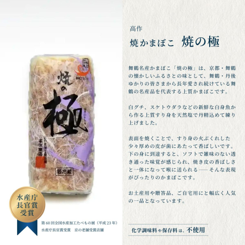 舞鶴名産かまぼこ「焼きの極」は、京都府舞鶴の懐かしいふるさとの味として、舞鶴ゆかりの皆さまから長年愛され続けてきた、舞鶴を代表する上質な蒲鉾です。