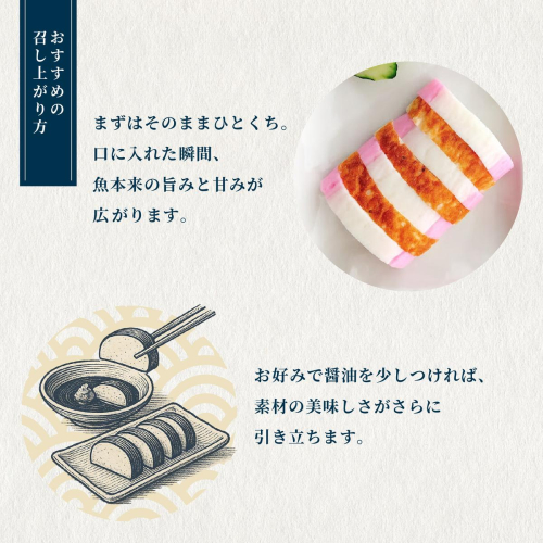 魚本来の旨味とほのかな甘みもしっかりと感じられ、高級かまぼこならではの伝統に磨き抜かれた味わいが魅力です。