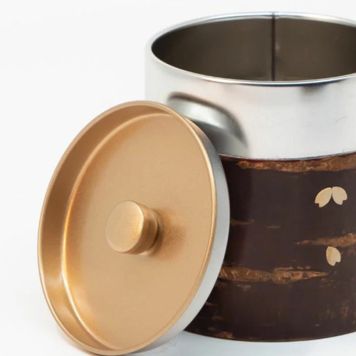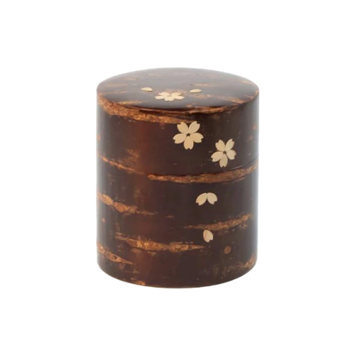 表面に桜皮を施し、桜の花びらがあしらわれた華やかな茶缶です。