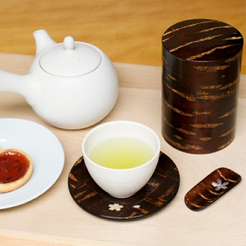 桜皮を市松模様に貼り合わせた樺細工の茶托です。
