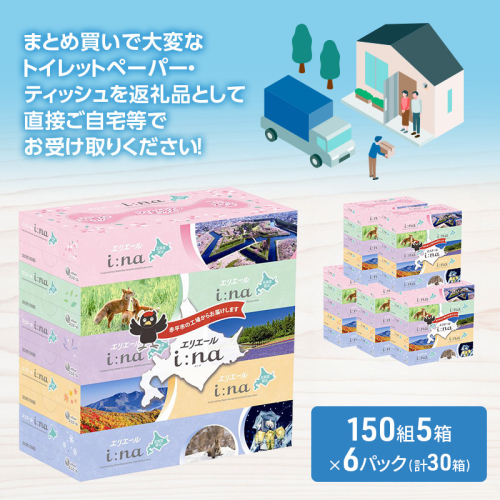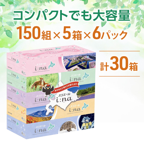 エリエール ハーフサイズ 収納に便利 コンパクト 【少量6パック】 i:na 北海道 ティシュー 150組 5箱 6パック 計30箱 最短 10日以内配送 最短配送 フィルムレス ふるさと納税限定デザイン イーナ 箱ティッシュ 備蓄品
