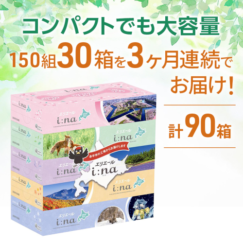- 定期便 3ヵ月連続お届け エリエール ハーフサイズ 収納に便利 コンパクト 【少量6パック】 i:na 北海道 ティシュー 150組 5箱 6パック 計30箱 フィルムレス ふるさと納税限定デザイン イーナ 箱ティッシュ 備蓄品