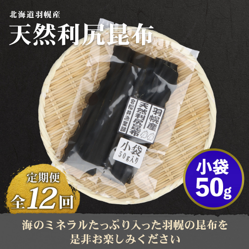 【定期便:全12回】 北海道羽幌町産 天然利尻昆布 小袋 50g | 昆布 天然昆布 こんぶ コンブ オンライン 申請 ふるさと納税 北海道 羽幌 利尻昆布 高級昆布 定期便 出汁 だし 昆布巻き 煮物 佃煮 北海道産昆布 羽幌町