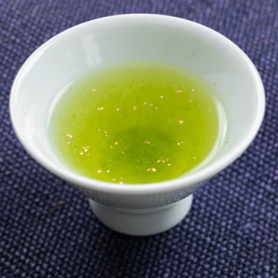 宮崎産の煎茶と高級抹茶に、きらめく金粉をあしらった華やかなお茶。
