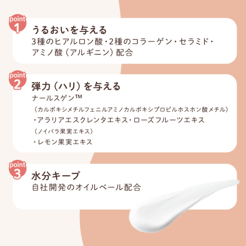 3種のヒアルロン酸・2種のコラーゲン・セラミド・アミノ酸(アルギニン)配合
