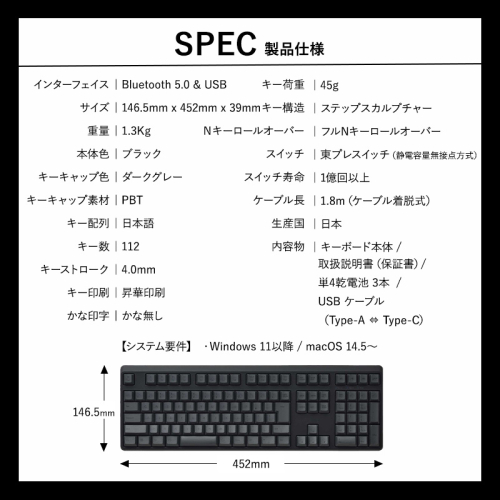 ・東プレスイッチと呼ばれる物理的な接点が無い静電容量無接点方式のキースイッチを搭載し、優れた信頼性と耐久性を実現
