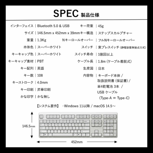 ・東プレスイッチと呼ばれる物理的な接点が無い静電容量無接点方式のキースイッチを搭載し、優れた信頼性と耐久性を実現