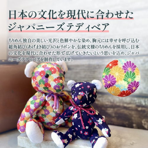 お鼻がちょこんとクラシカルな顔立ち、胸元には幸せを呼び込む総角結び(あげまき結び)のおリボンを。ちりめん独自の美しい光沢と色鮮やかな染め、伸縮性が活かされたぷっくりフォルムが魅力のジャパニーズテディベア。フランス語の「光」が語源となったレーヨンで織られた一越、二越のちりめんを使用しています。紙と同じように木材から作られるレーヨンは環境に優しい再生繊維です。昨今では現代的な模様もイロイロ出てきていますが、私たち創作姉妹では四季の草花や青海波など伝統文様をモチーフとしたちりめんを採用。日本の文化を現代に合わせた形で広げていきたいという思いを込め、ジャパニーズテディベアを制作しています。