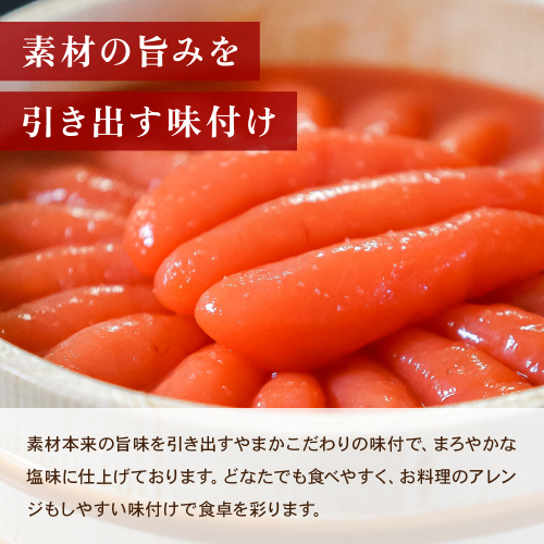 良質な完熟したたらこの1本物と切子を保存しやすい小分けのパックに詰めました。原料は高品質のアメリカ産たらこを使用しております。塩たらこは原料の鮮度が品質に大きく影響します。そこで選ばれたのが、アメリカ産たらこです。冬のベーリング海で漁獲したスケトウダラから採卵し、急速凍結を行った完熟卵のみを使用しております。素材本来の旨味を引き出す味付に仕上げました。口の中ではじけるプチプチの粒子感と塩たらこの本来の美味しさをご堪能ください。