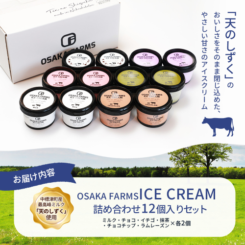 OSAKA FARMS ICE CREAM 詰め合わせ12個入りセット(ミルク・チョコ・イチゴ・抹茶・チョコチップ・ラムレーズン)6種×各2個 | ふるさと納税 北海道 中標津 詰め合わせ アイス ミルク 天のしずく 乳製品 贈り物 セット スイーツ おやつ 食後 デザート お取り寄せ ワンストップ マイページ OSAKA FARMS 中標津町