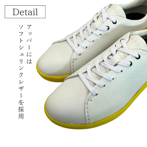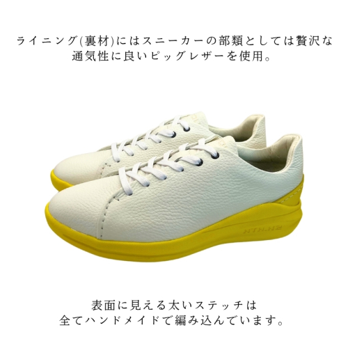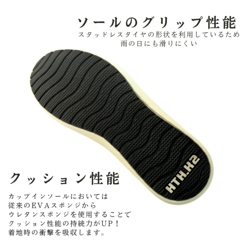 アッパーには、ソフトシュリンクレザーを採用し、ライニングにはスニーカーの部類としては贅沢なピッグレザー(通気性に良い)を全体に使用しています。表面に見える太いステッチは全てハンドメイドで編み込んでいます。ソールのグリップ性能は、スタッドレスタイヤの形状を利用している為、雨の日には滑りにくくなっています*1。また、カップインソールにおいては、従来のEVAスポンジからウレタンスポンジを使用することによりクッション性能の持続力がUPされ着地時の衝撃を吸収します。1歩行状況によっては、まったく滑らないということではありません。個人差がございますので歩行には十分にご注意下さい。