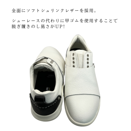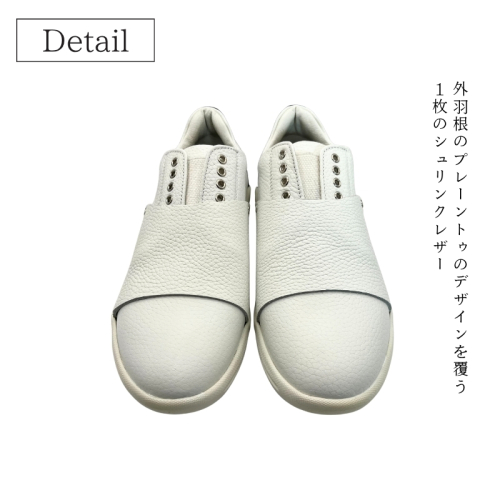 外羽根のプレーントゥのデザインを覆う1枚のシュリンクレザーが特徴。また、シューレースの代わりに甲ゴムを使用することで脱ぎ履きのし易さがUP。全面にソフトシュリンクレザーを採用し、ライニングにはスニーカーの部類としては贅沢なピッグレザー(通気性に良い)を全体に使用しています。表面に見える太いステッチは全てハンドメイドで編み込んでいます。ソールのグリップ性能は、スタッドレスタイヤの形状を利用している為、雨の日には滑りにくくなっています*1。また、カップインソールにおいては、従来のEVAスポンジからウレタンスポンジを使用することによりクッション性能の持続力がUPされ着地時の衝撃を吸収します。 1歩行状況によっては、まったく滑らないということではありません。個人差がございますので歩行には十分にご注意下さい。
