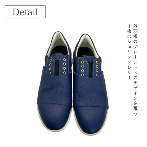 外羽根のプレーントゥのデザインを覆う1枚のシュリンクレザーが特徴。また、シューレースの代わりに甲ゴムを使用することで脱ぎ履きのし易さがUP。全面にソフトシュリンクレザーを採用し、ライニングにはスニーカーの部類としては贅沢なピッグレザー(通気性に良い)を全体に使用しています。表面に見える太いステッチは全てハンドメイドで編み込んでいます。ソールのグリップ性能は、スタッドレスタイヤの形状を利用している為、雨の日には滑りにくくなっています*1。また、カップインソールにおいては、従来のEVAスポンジからウレタンスポンジを使用することによりクッション性能の持続力がUPされ着地時の衝撃を吸収します。 1歩行状況によっては、まったく滑らないということではありません。個人差がございますので歩行には十分にご注意下さい。