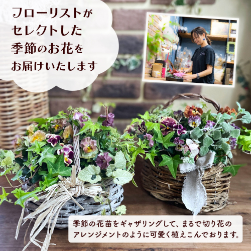 季節の花苗をギャザリングして、まるで切り花のアレンジメントの様に可愛く植えこんでおります。