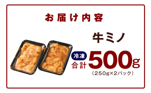 - 焼肉用 牛ミノ 500g 【味付き 秘伝のタレ漬け 250g×2P 小分け 焼くだけ ホルモン コリコリ食感 BBQ おかず おつまみ】 010B1854
