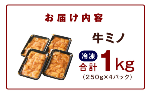 - 焼肉用 牛ミノ 1kg 【味付き 秘伝のタレ漬け 250g×4P 小分け 焼くだけ ホルモン コリコリ食感 BBQ おかず おつまみ】 015B594