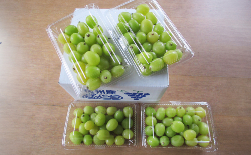 生産者コメント:樹上で完熟した房は黄色しておりますが甘みが増して大変美味しく召し上がっていただけます。粒の大きさは大小色々、粒色も緑・黄色が混ざっています。天候状況により稀に種が入ることがあります。