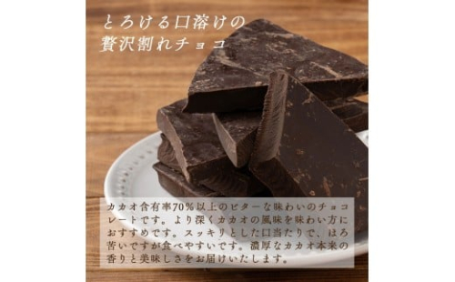 「割れチョコ ハイカカオ」は、カカオ含有率70%以上の濃厚な味わいと、溶けるような口当たりが魅力のビターチョコレートです。