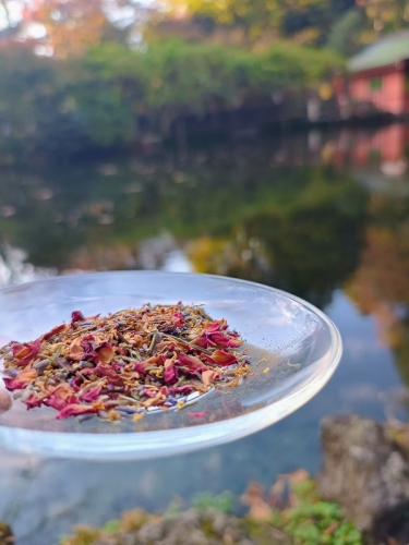 富士宮ブレンドハーブティー 富士宮浅間大社に祀られた木花咲耶姫は、絶世の美女と言われ火の中で子供を出産する強さを持つ火、水、農業出産の神社です。 【効果】 このハーブティーには9種類のハーブが入っています。 特にハイビスカスとローズヒップがベーズとなっております。ハイビスカスにはビタミンcや疲労を回復する効果やカリュウムも豊富に含まれていて利尿効果があります。 ローズヒップに多く含まれるビタミンcには紫外線で出来たメラニンの生成を抑えてシミやそばかすを予防したり、コラーゲンを再生する効果があると言われています。 その他にもシナモンやジンジャーエールが入っているので体を温める効果も期待されます。 【想い】 ハーブ、植物は一つ一つで 木花咲耶姫を飲んで、少しでも富士宮を想い出していただけたらと思います。