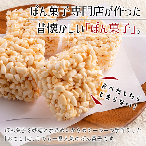 ぽん菓子を砂糖と水あめにからめて一つ一つ手作りした「おこし」は、今でも一番人気!