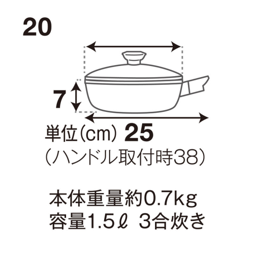 ●サイズ/外径20×高さ7×最大長38cm・底厚4.7mm以上、ハンドル取外し時:最大長25cm