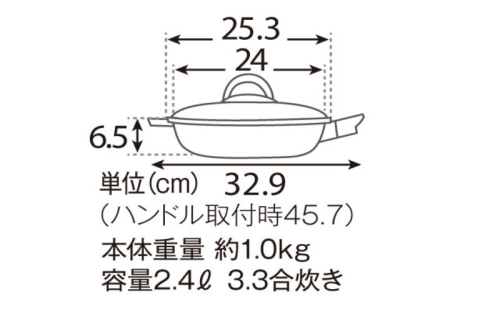 ●サイズ/浅型:外径25.3×高さ6.5×最大長45.7cm・底厚5mm以上、ハンドル取外し時:最大長32.9cm