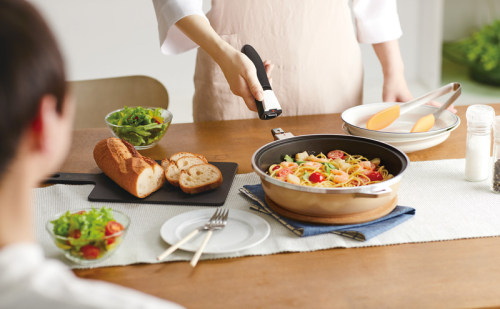 「油ナシ!」でヘルシーに均一に焼けるフライパン。浅型は従来より1.2cm浅くなり、返しやすさと手軽さがさらにアップ。野菜や卵をゆでる時もほんの少しの水でOK!素材の旨味や栄養をしっかり残し、色鮮やかに仕上げます。その秘訣は、丁寧な手造り製法から生まれる材質「多孔質アルミ」と、アサヒ独自のコーティング。50レシピ掲載のレシピ集も付属。おいしさと健康を考え生まれた、職人たちこだわりの一台です。