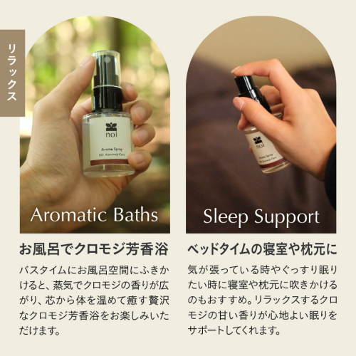 樹木とは思えないほど芳醇で甘くスパイシーな香りを持つクロモジ (黒文字) と、ベルガモットの爽やかな柑橘香が気持ちを落ち着かせ、優しく包み込んでくれます。