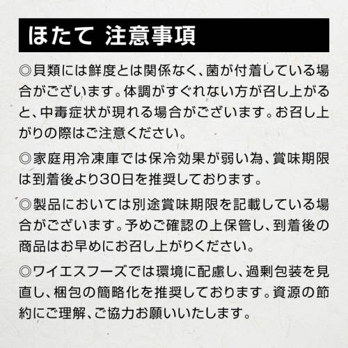 ※貝類には鮮度とは関係なく菌が付着している場合があり、体調が優れない方が召し上がると中毒症状が現れる可能性がございます。
