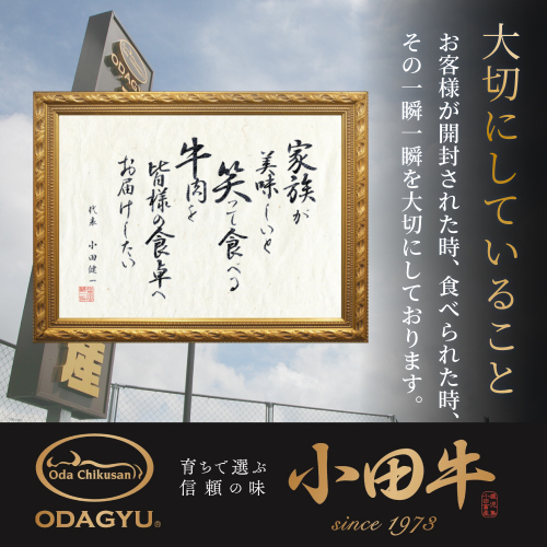 生産者の名前をブランドに持ち、米や大麦を餌に取り入れ、黒毛和牛本来の「味のある牛肉」をつくり続けて45年、私共の「小田牛」を是非ご賞味下さい。
