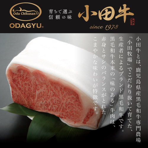 小田牛とは、小田健一が1973年就農の鹿児島県産黒毛和牛専門農場「小田牧場」で育てた、生産者によるプレミアムブランド黒毛和牛です。