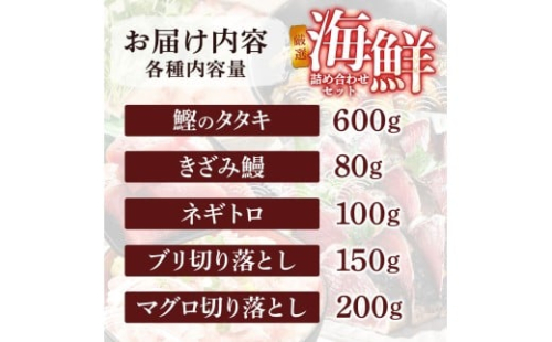 厳選 海鮮5種詰め合わせセット 鰹のタタキ600g マグロ切り落とし200g ブリ切り落とし150g きざみ鰻80g ネギトロ100g かつお カツオ まぐろ 鮪 ぶり うなぎ 冷凍 高知 小分け おいしい 高知県 田野町
