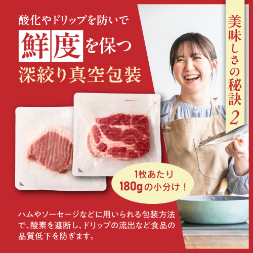 きめ細かい筋繊維を持つ霧島黒豚は、保水性と肉の締まりが良く、独特の食感と旨みが特徴です。 ロース・肩ロースステーキ用を使いやすいよう一枚ずつ個包装し、鮮度を長く保てる深絞り真空包装でお届けします。