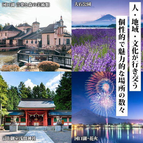 都心から車で約90分の場所に位置する富士河口湖町では、河口湖美術館や河口湖ステラシアターなどの文化・観光施設のほか、富士山と湖が眺望できる温泉郷、旅館、ホテルなどの宿泊施設も充実しています。 ハーブフェスティバルや紅葉まつりなど季節を感じることのできるイベントのほかにも、富士山河口湖音楽祭や、4つの湖で行われる花火大会、マラソンなど多彩なイベントが開催され、1年を通じて楽しむことができます。