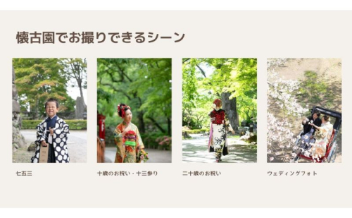懐古園は小諸のお城跡にある四季折々に美しい景色の中にある庭園です。 お好きな季節に家族や仲間との記念撮影にご利用ください。 そのトキを彩り、未来へお届けするお手伝いをさせていただきます! こんな方にお勧めです! ☆家族への感謝の気持ちを形にしたい ☆家族そろって写真を撮りたい ☆節目を大切にしたい 【ご予約の流れ】 必ず事前にメールまたは公式LINEへの連絡の上、ご予約をお願いいたします。 詳細は別途お送りするお礼状をご確認くださいませ。 【お問い合わせ先】 所在地:長野県小諸市鶴巻 TEL:090-5790-3428 定休日:不定期 ※詳しくはメールまた公式LINEにてお問い合わせください。 ■返礼品の地場産品基準■ 小諸市内の施設利用券