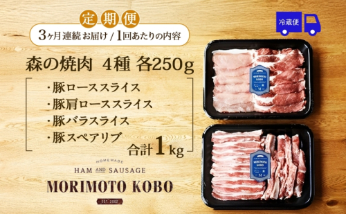 3カ月定期便 森本工房 森の焼肉 飛騨・美濃けんとん 4種 セット計1kg 各250g 焼肉 肉 お肉 豚肉 ブランド豚 ポーク 豚バラ スペアリブ ロース 肩ロース 食べ比べ 詰め合わせ BBQ 冷蔵 送料無料 岐阜県 揖斐川町