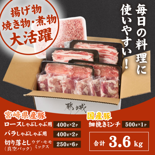 宮崎県産豚肉をしゃぶしゃぶ用スライスと切り落とし、国産豚肉の細挽きミンチ肉をセットにして、ボリュームたっぷり総重量3.6kgをお届けします。