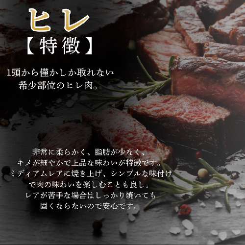 1頭の牛(500kg程度)から6~7kg程度しかとれないヒレ肉は、牛肉の中でも最も柔らかく肉質の良い赤身肉です。
