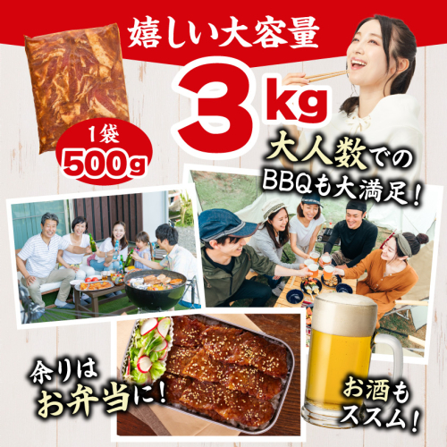 焼肉用にカットした宮崎県産の豚バラ肉を味噌たれで味付けしました。 じっくり漬け込んでいるので、濃厚な味わいで食べ応え抜群! 香ばしく、甘辛い味付けで、ご飯もお酒もすすみます! ガッツリと豚丼、野菜で包んでさっぱりと、お肉と野菜を一緒に炒めていただくのもおすすめです。 500gずつのパックを6袋、総重量たっぷり3kgお届けします。美味しさで心満足、ボリュームたっぷりでお腹満足♪ 是非、豚カルビたれ漬けをご堪能ください。