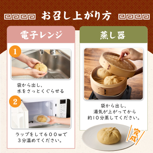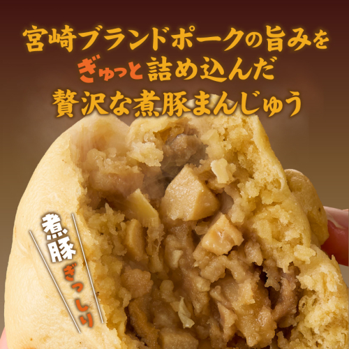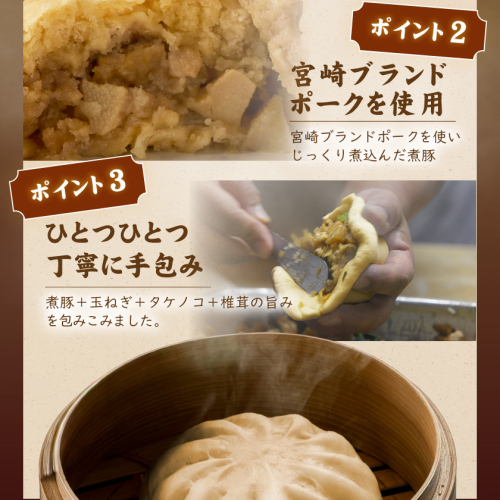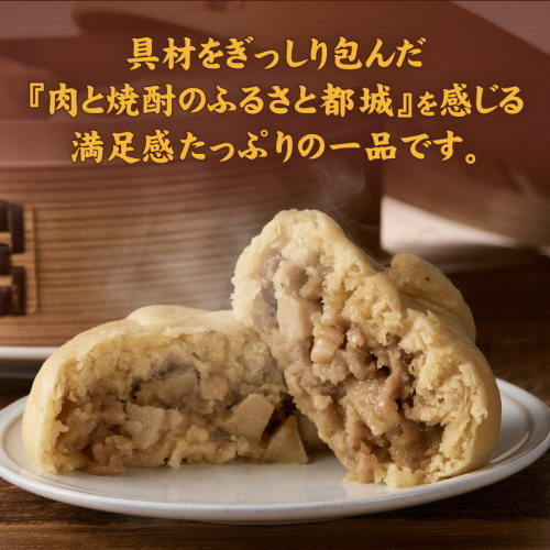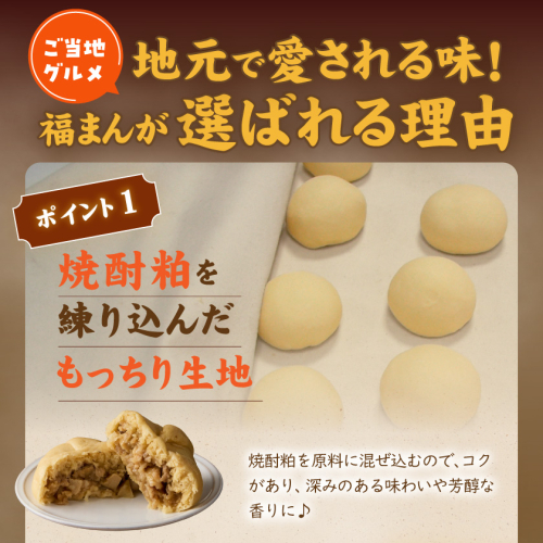 宮崎ブランドポークを使いじっくり煮込んだ煮豚と玉ねぎ、タケノコ、椎茸を加えた具材を、ひとつひとつ丁寧に手包みした肉まん「福まん(煮豚まんじゅう)」です。 都城市内の酒造メーカーで焼酎を作る際にできる麦焼酎粕を、生地に練りこみました!焼酎粕を原料に混ぜ込むので、コクがあり、深みのある味わいや芳醇な香りに♪ もっちり生地に、具材をぎっしり包んだ『肉と焼酎のふるさと都城』を感じる満足感たっぷりの一品です。 〔お召し上がり方〕 〇電子レンジの場合:袋から出し、水にくぐらせ、ラップをして600wで3分温めてください。 〇蒸し器の場合:袋から出し、湯気が上がってから約10分蒸してください。 ※袋のまま加熱しないでください。