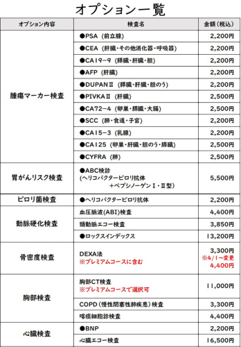 子宮頸がん検査、乳がん検査、腫瘍マーカー検査、超音波検査などの追加オプション検査