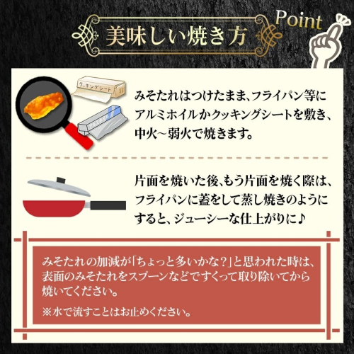 味噌だれはつけたまま、フライパン等にアルミホイルまたはクッキングシートを敷き、中火~弱火で調理されることをおすすめします。また、片面を焼いたのちに、返してもう片面を焼く際は、フライパンに蓋をして蒸し焼きのようにすると、ジューシーな仕上がりになります♪