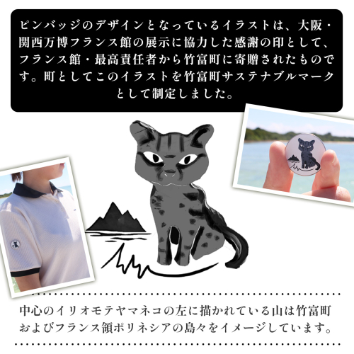 このピンバッジは、大阪・関西万博フランス館に展示された竹富町のイリオモテヤマネコ像をモチーフとしたイラストがデザインされた竹富町サステナブルマーク公式グッズとなります。