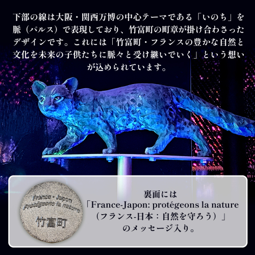 下部の線は大阪・関西万博の中心テーマである「いのち」を脈(パルス)で表現しており、竹富町の町章が掛け合わさったデザインです。これには「竹富町・フランスの豊かな自然と文化を未来の子供たちに脈々と受け継いでいく」という想いが込められています。