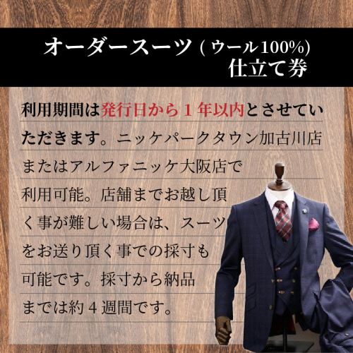 ウール100%で、ビジネスシーンにも活躍するオーダースーツ仕立券1着分をお届けします。