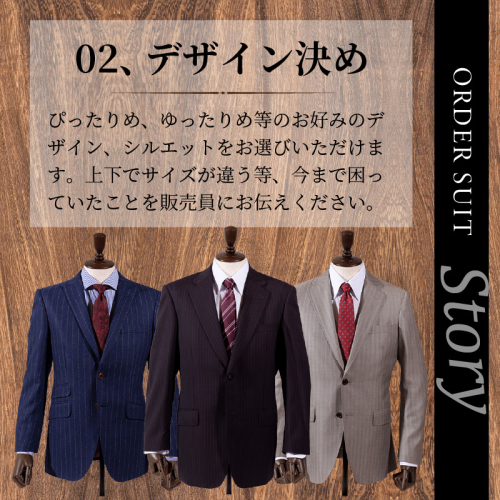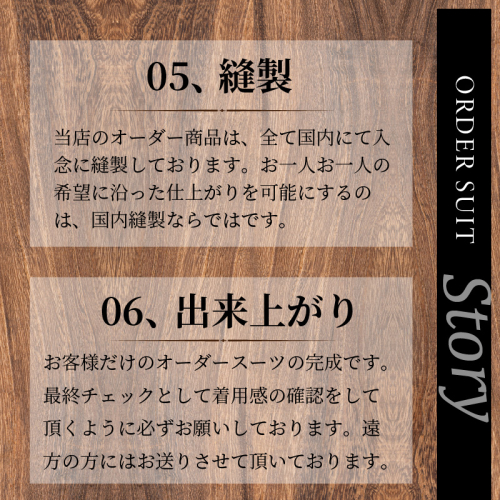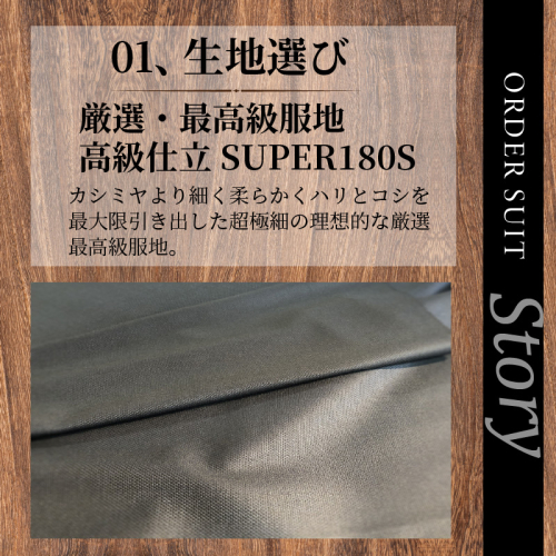 ●オーダースーツ:ウール100%厳選最高級服地(国内縫製)