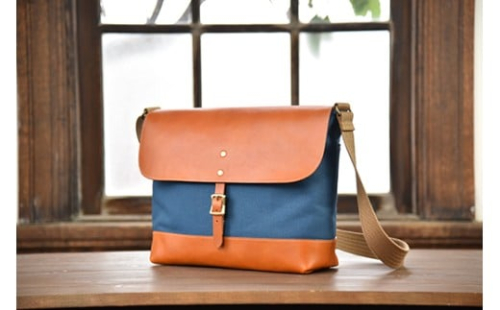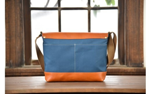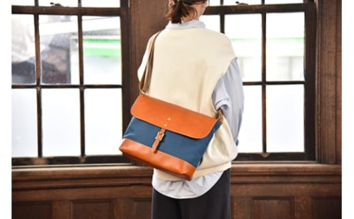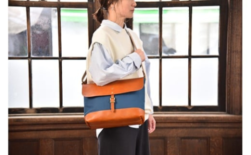 近江牛レザーと地産帆布で作ったショルダーバッグ びわ湖ブルー Lサイズ【CC41W】